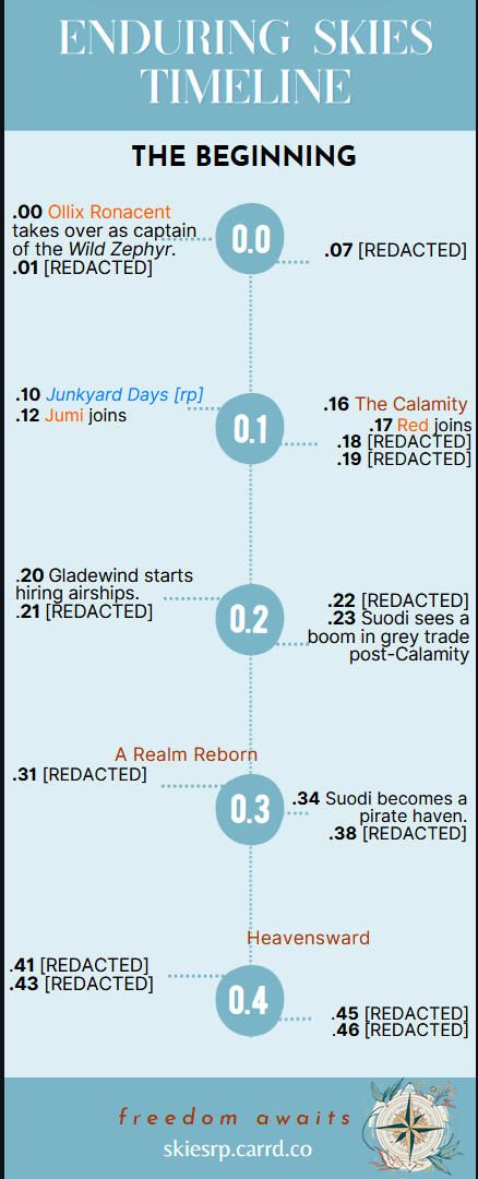 Enduring Skies is a diceless, narrative and character development heavy, pirate and grey-trade roleplaying group. We're here to cooperatively write low-powered stories about mundane people doing extraordinary things in an everyday way. A dark fantasy pirate version of Firefly meets the crew of the Rocinante from Expanse, set amidst the greater scope of ffxiv.We have purposefully gathered characters who range between good, bad, and complicated. We want there to be problems that cause moral quandaries. We want characters to be challenged on where they stand, and encourage inter-character conflict over what is the right way to do thing.Due to this, the separation of ic and ooc behaviors and thoughts is extremely important to us. We are not our characters.