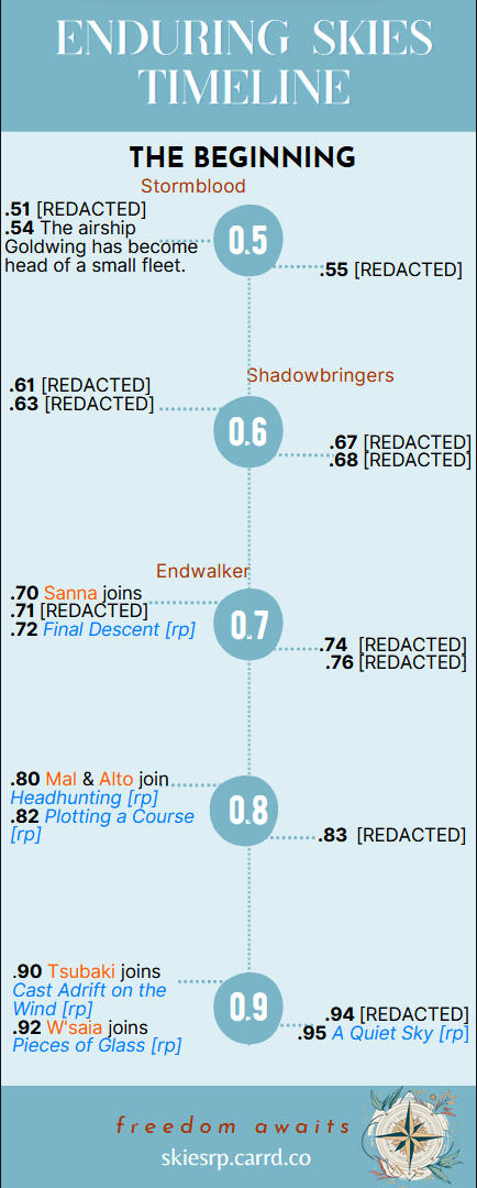We use a decimal system to show the order of our rp, so we don't need to rely on hard dates(barring the 5 year gap between the calamity and ARR). It is our way of trying to stay flexible given that we do not have hard dates on when msq happens. Should we ever get hard dates, we will adjust accordingly.Regular rp threads are in blue, member names in orange, game events in brown, campaign specific rp in yellow.